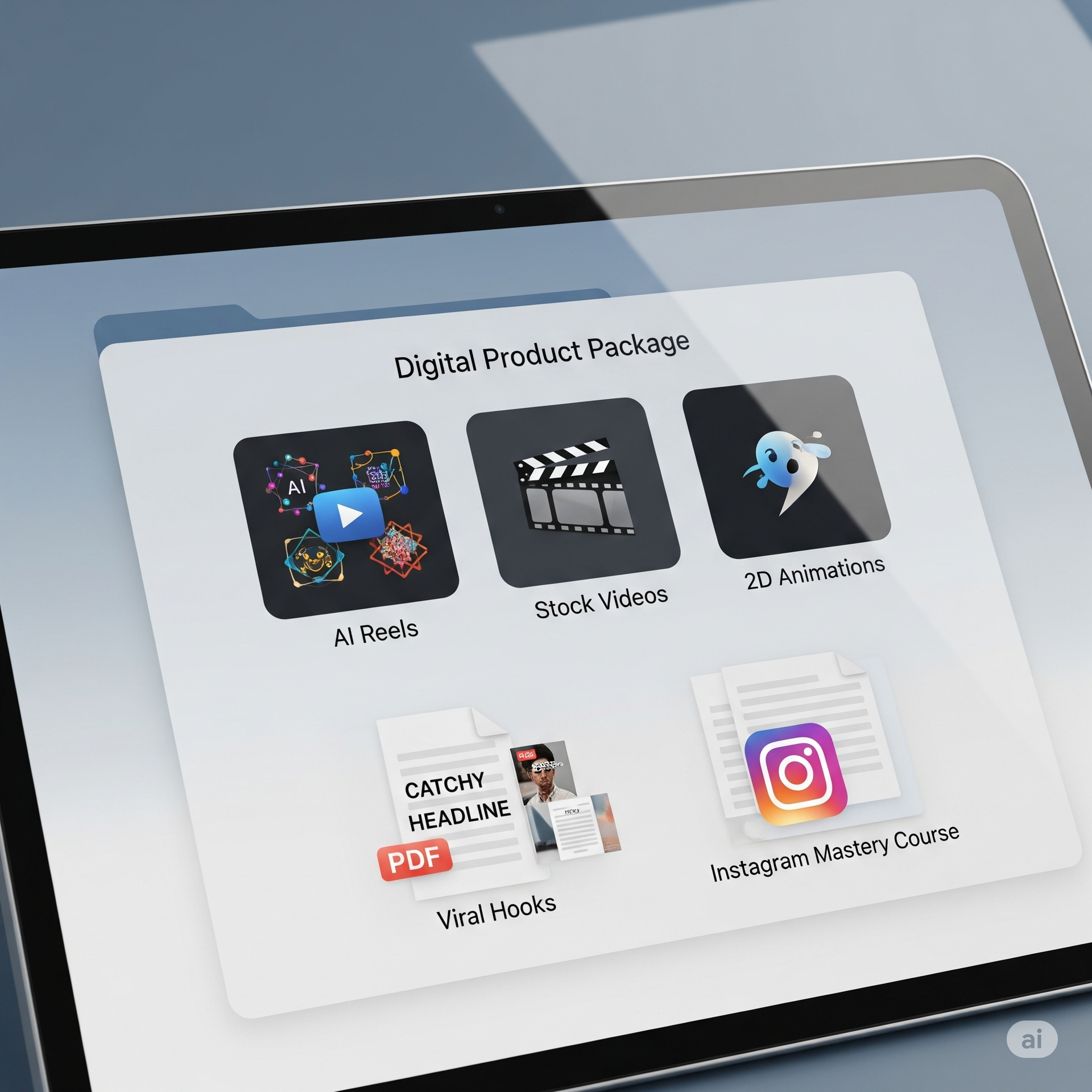 An image of a laptop or tablet screen with a folder open, showing icons for "AI Reels," "Stock Videos," "2D Animations," and PDF icons for "Viral Hooks" and "Instagram Mastery Course."